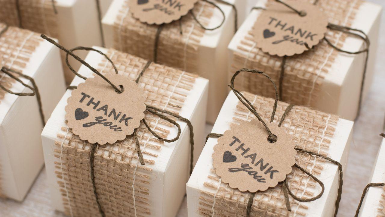 Personalized wedding favors like engraved champagne flutes or candles