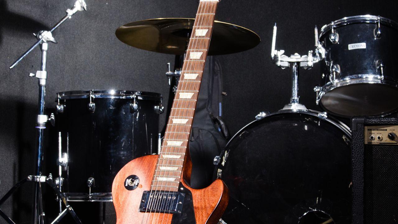 A set of traditional musical instruments like tabla or harmonium