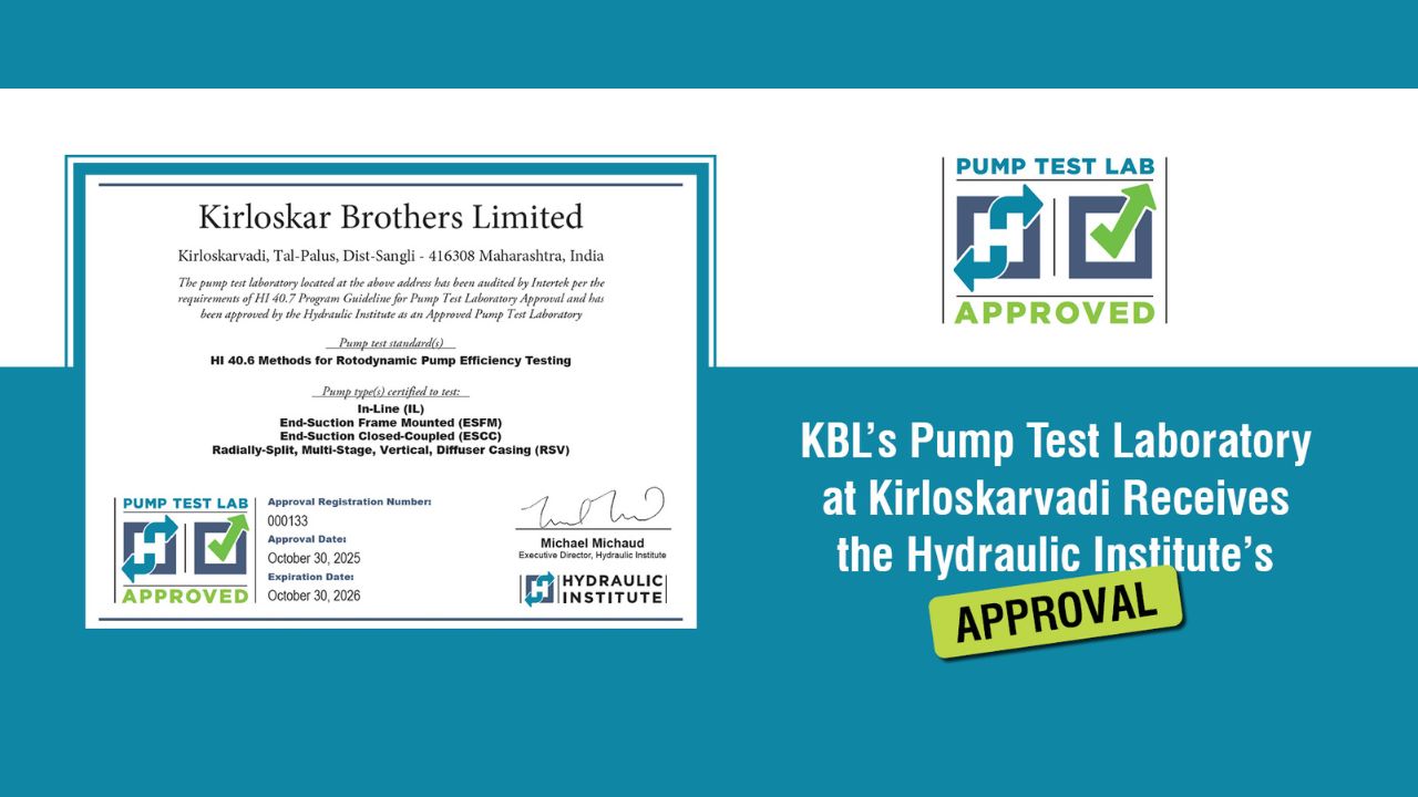 The Hydraulic Institute introduces member company, Kirloskar Brothers Limited (KBL), as the latest company to have their pump test laboratory, located at Kirloskarvadi, Maharashtra approved through the HI Pump Test Lab Approval Program.